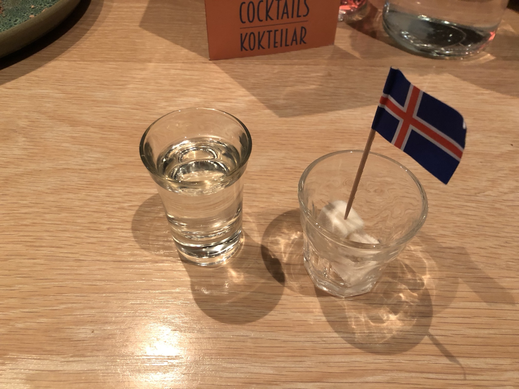 Ein Dessert musste ich zum Abschluss noch probieren: Hákarl, kurz gesagt fermentierter Grönlandhai, wird zusammen mit dem Kümmelschnaps Brennivín serviert. Man muss ihn nicht zwingend mögen, aber er ist eine Erfahrung wert.